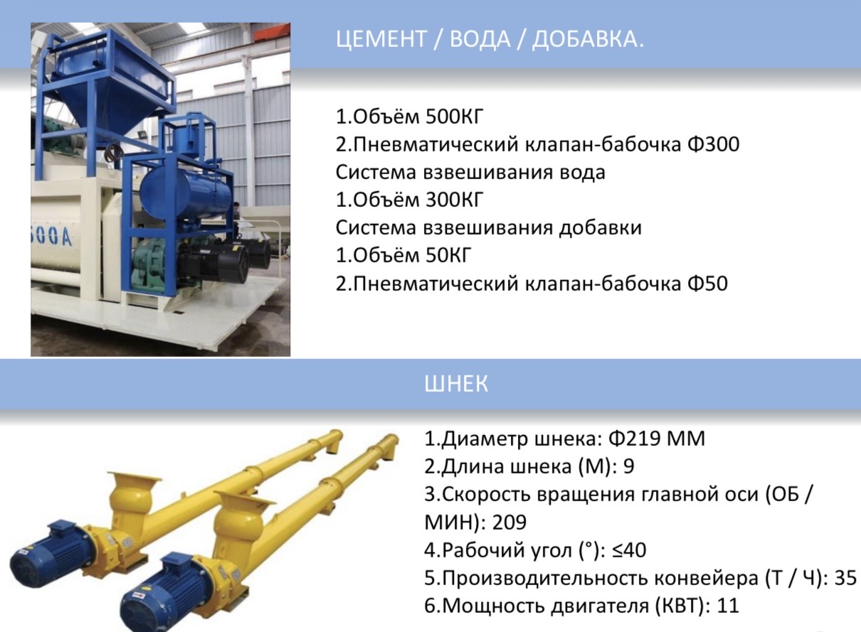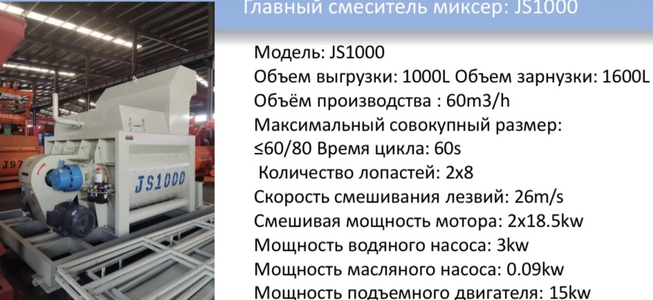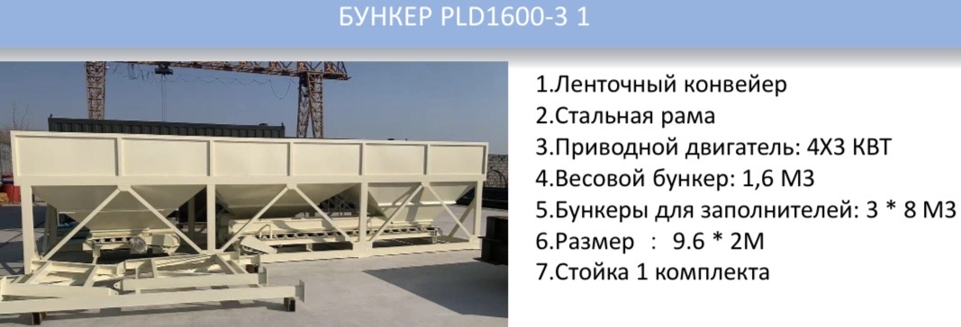 в разобранном виде состоит из: Смеситель JS 1000 - 1шт, PLD 1600-3 - 1шт, Весы для воды - 1шт, Весы для хим.добавки - 1шт, Весы для цемента - 1шт, Шнек - 1шт, Компрессор - 1шт, Воронка для выхода гот. Смеси - 1шт, Автоматический пульт управления - 1 комплект, Металлическая конструкция - 1шт, Ленточный конвейер - 1 комплект, Насос 1шт. Производитель: Китай - вес: 15620 кг, кол. 1 шт, ; 81 мест